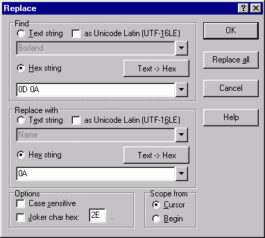 This converts a DOS file into UNIX file format. The most recently used text and hex strings for both find and replace input fields are saved in XVI32.INI file.